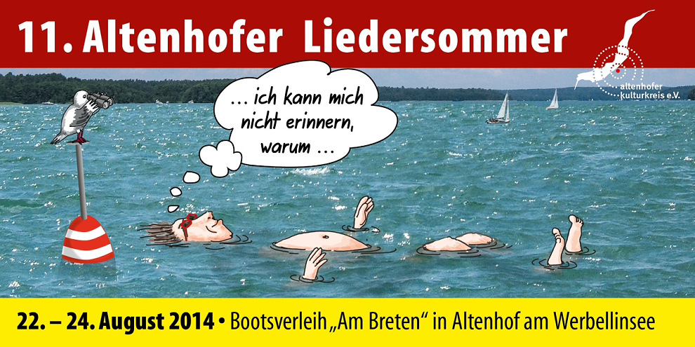 ![]() P R O G R A M M „11. Altenhofer Liedersommer“ 22. bis 24. August 2014 „ ... ich kann mich nicht erinnern, warum ... “ ![]() ![]() ![]() Freitag, 22. August 2014 19°° Uhr Ausstellungseröffnung: „Vogelmädchen“, Bilder von Lena Staritsyna 20°° Uhr iMAGIEnAIRe - Gundermann-Songs am Lagerfeuer mit Cathrin Pfeifer und Sonny Thet, www.cathrin-pfeifer.de und www.sonnythet.de Samstag, 23. August 2014 16°° Uhr Kinder-Konzert "Die Vier" 20°° Uhr Liedermacher-Konzert mit - Hisztory, www.hisztory.blogsport.de - Friedrich & Wiesenhütter, www.friedrich-wiesenhuetter.de - Bolschewistische Kurkapelle - Schwarz-Rot, www.bolschewistischekurkapelle.org - Text und Moderation: Ahne, www.ahne-international.de Sonntag, 24. August 2014 11°° Uhr Robbi taucht auf - Kinder-Programm von Dina Straat Weitere Veranstaltungen des akk e.V.: Pfingstsamstag 07. 06. 2014 um 20°° Uhr: Florian Havemann liest, was er will Pfingstsonntag 08.06.2014 um 16°° Uhr Konzert: Satire trifft Blues mit den Schwärzefüssen www.schwärzefüsse.de Sommernachtsfest zur Solarboot-Rallye, 14.06.2014 Auf der Walz Von Blues n´ Grass nach Folk n ´Roll - mit Iris Gleichen www.iris-gleichen.de |