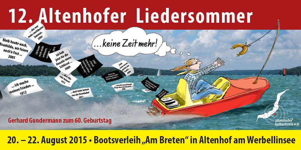![]() P R O G R A M M „12. Altenhofer Liedersommer“ 20. bis 22. August 2015 Gerhard Gundermann zum 60. Geburtstag: „und ich habe keine Zeit mehr... ![]() ![]() ![]() Donnerstag, 20. August 2015 20°° Uhr Galeriegespräch mit Harald Hauswald im Bootshaus am Breten Freitag, 21. August 2015 Ausstellung Harald Hauswald im Bootshaus am Breten 20°° Uhr Duo Infernale (Dirk Zoellner; André Gensicke) www.dirk-zoellner.de feat. Sonny Thet www.sonnythet.de Songs am Lagerfeuer Samstag, 22. August 2015 15.30 Uhr Kinderprogramm mit Stellmäcke: Das "Leuteliederhaus" 20°° Uhr Liedermacher-Konzert mit - Stellmäcke & Band www.stellmaecke.de - Dota Kehr und Band www.kleingeldprinzessin.de - Haase & Band www.haase-band.de - Andreas Hähle Text und Moderation www.andreas-haehle.de |